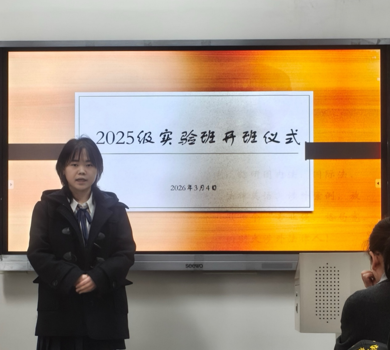 为深化涉外法治人才培养,2026年3月4日,法学院2025级涉外法治实验班开班仪式在D401教室举行。本次开班仪式标志着第六届涉外法治实验班正式扬帆起航。法学院党委书记闻琳、党委副书记孙悦、北京炜衡(天津)律师事务所高级合伙人李宁律师、2025级实验班导师冯子涵以及法实2201班学生代表朱丽丹出席,仪式由法学院副院长樊纪伟主持。
