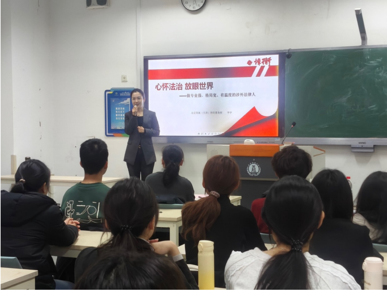 本次仪式还特别邀请了北京炜衡(天津)律师事务所高级合伙人李宁律师,为新生们带来了一场关于“心怀法治、放眼世界”涉外法治实践前沿的精彩分享。李宁律师结合自身丰富的实务经验,深入浅出地介绍了涉外法治专业的职业前景以及所需的七大核心能力。李宁律师指出,随着全球化进程的加速,市场对涉外法治人才的需求日益增长。他结合律所的国际化布局,分析了当前在国际商事解决、航运贸易、跨境融资、知识产权保护、数据合规、海事海商以及家事财富传承等多个涉外法治热门领域的机遇与挑战。李宁律师通过列举诸多成功的涉外案例,生动描绘了未来就业可能涉足的业务领域,并寄语同学们要具备坚韧不拔的意志、持续学习的能力和开阔的国际视野等。