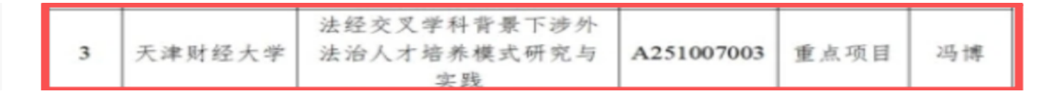 近日,天津市普通高等学校本科教学质量与教学改革研究计划项目立项结果公布,法学院冯博教授牵头申报的《法经交叉学科背景下涉外法治人才培养模式研究与实践》成功获批重点项目,这是我院在涉外法治人才培养教学改革研究领域的又一重要突破,将为新时代复合型涉外法治人才培育提供全新的实践路径与理论支撑。